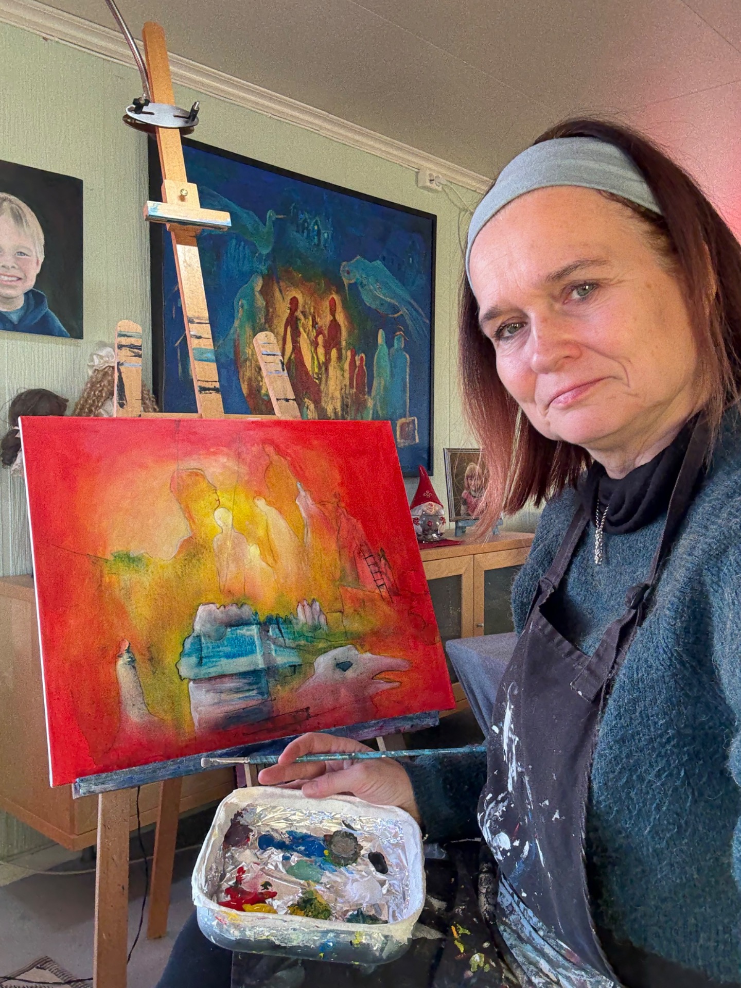 “Etter mange år med for mykje stress, har det å male bilder vore ein skapende oase for å hente tilbake tapt energi. Eg har vore sliten når eg begynte å male men undervegs i maleprosessen har eg opplevd at eg blir så oppslukt i maleriet at energien kjem tilbake. Kjensla av maleglede og mestring i kombinasjon med å vere til stades her og no. Dette er noko som dessverre blir for lite av elles i ein travel kvardag.”
